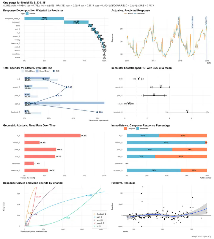 Robyn is an experimental, semi-automated and open-sourced Marketing Mix Modeling (MMM) package from Meta Marketing Science. It uses various machine learning techniques (Ridge regression, multi-objective evolutionary algorithm for hyperparameter optimization, time-series decomposition for trend & season, gradient-based optimization for budget allocation, clustering, etc.) to define media channel efficiency and effectivity, explore adstock rates and saturation curves. It’s built for granular datasets with many independent variables and therefore especially suitable for digital and direct response advertisers with rich data sources. I applied this on my own data. More details in my github.